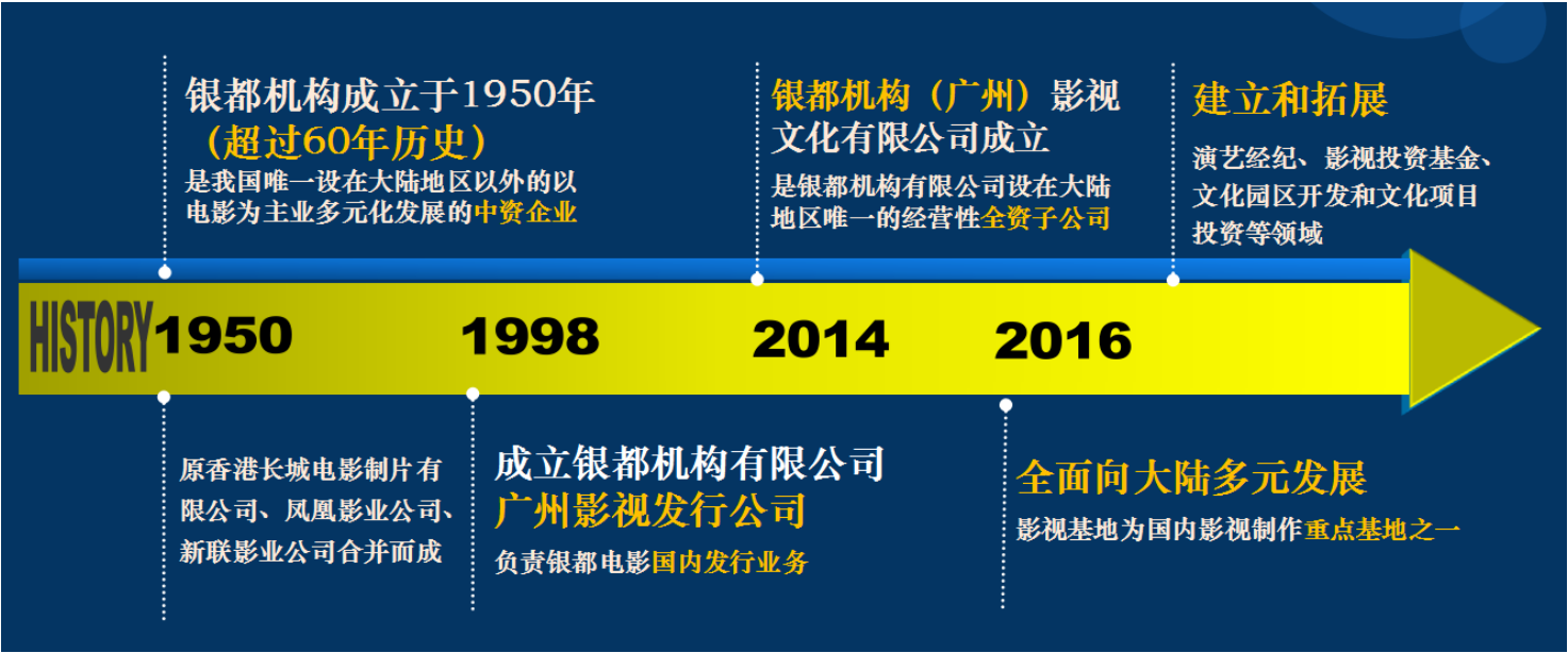 銀都機(jī)構(gòu)(廣州)影視文化有限公司是銀都機(jī)構(gòu)有限公司(香港)設(shè)在大陸地區(qū)唯一的經(jīng)營性全資子公司,公司具備影視項(xiàng)目策劃制作、影棚經(jīng)營服務(wù)、影片宣傳發(fā)行等綜合功能。