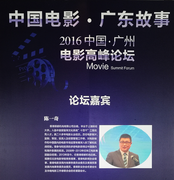 12月15日,“2016中國·廣州電影高峰論壇”在廣州塔金逸空中電影城舉行,香港銀都機構有限公司總裁陳一奇作為主講嘉賓受邀出席。